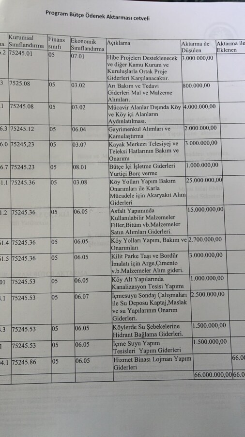 Hibe projeleri desteklenecek ve diğer kamu Kurum ve Kuruluşlarla ortak proje giderleri karşılanması için ayrılan 3 milyon TL., Arı Bakım ve Tedavi Giderleri Mal ve Malzeme Alımları için ayrılan 800 Bin TL., Mücavir alanlar dışında ki köy ve köy içi aydınlatması için ayrılan 4 Milyon TL., Gayrimenkul adımları ve kamulaştırma için ayrılan 2 milyon TL., Kayak merkezi telesiyeji ve teleksi hatlarının bakım ve onarımı için ayrılan 3 Milyon TL., Bütçe içi işletme giderleri Yurt içi borç verme için ayrılan 1 milyon TL., Köy yolları yapım, bakım, onarımları ile karla mübadele için akaryakıt alım giderleri için ayrılan 25 Milyon TL., Asfalt yapımında kullanılabilir malzemeler satın alma giderleri için ayrılan 15 milyon TL., Köy yolları yapım, bakım ve onarımları için ayrılan 2 milyon 700 Bin TL., Kiit parke taşı ve bodür imalatı için Arge, çimento v.b. malzemeleri alım giderleri için ayrılan 3 Milyon TL., Köy alt yapılarında kanalizasyon tesisi yapımı için ayrılan 1 milyon TL., İçme suyu sondaj, çalışmaları ile su deposu kaptaj, maslak ve su yapılarının onarımı giderleri için ayrılan 2.5 Milyon TL., Köylerde su şebekelerine hidrant bağlama giderleri için ayrılan 15 milyon TL., İçme suyu yapm tesisileri yapım giderleri için ayrılan 1.5 milyon TL., ve Hizmet binası lojman yapım giderleri için 66 Milyon TL.’yi harcamayan ve bu paranın tümünün Anjiyo merkezini bir türlü bitiremeyen ve şu an Özel idareye Lojman yapan firmaya aktarılması isteyen İl Özel İdarenin bu paraları istediği Ardahan İl Genel Meclis Üyeleri, bütçelerinde parası olan ama çalışıp, hizmet edilmediğinden harcanmayan bu parayı isteyen Ardahan İl Özel İdarenin teklifini, ‘Sen biraz çalışta bu paraların ayrıldığı hizmetleri yapta öyle gel..’ diyerek oy birliği ile ret etti.