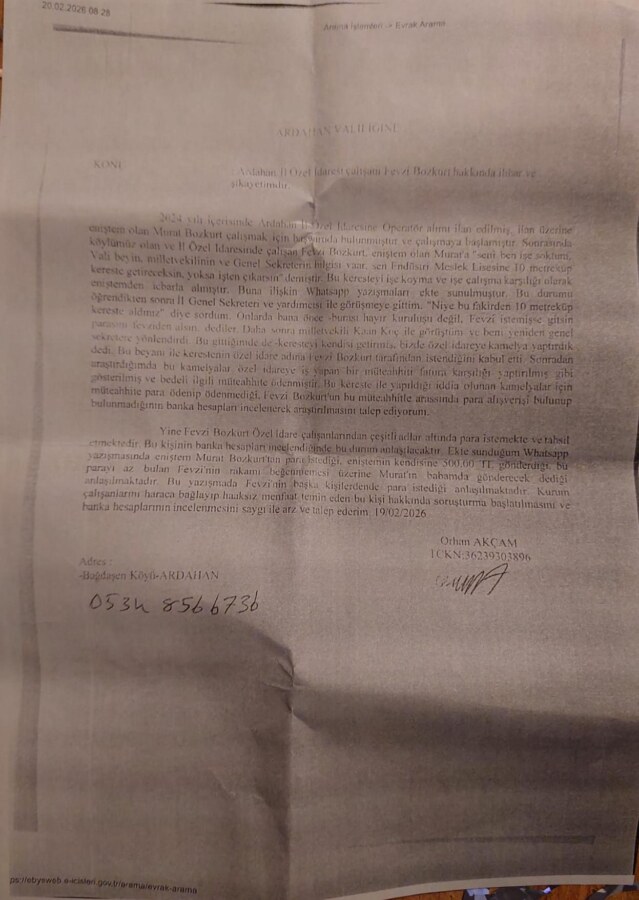Rüşvet karşılığında işe alımlar yapıldığı ve bu yönde şikayet iddialarının bir dilekçe ile ulaştırtıldığı Ardahan kamuoyunda ‘Kereste Rüşveti’ diye adlandırılan bu konunun ne aşamada olduğu ve suçlanan şahsı ile yetkililer hakkında soruşturma başlatılıp, başlatılmadığı merak edilmekte.