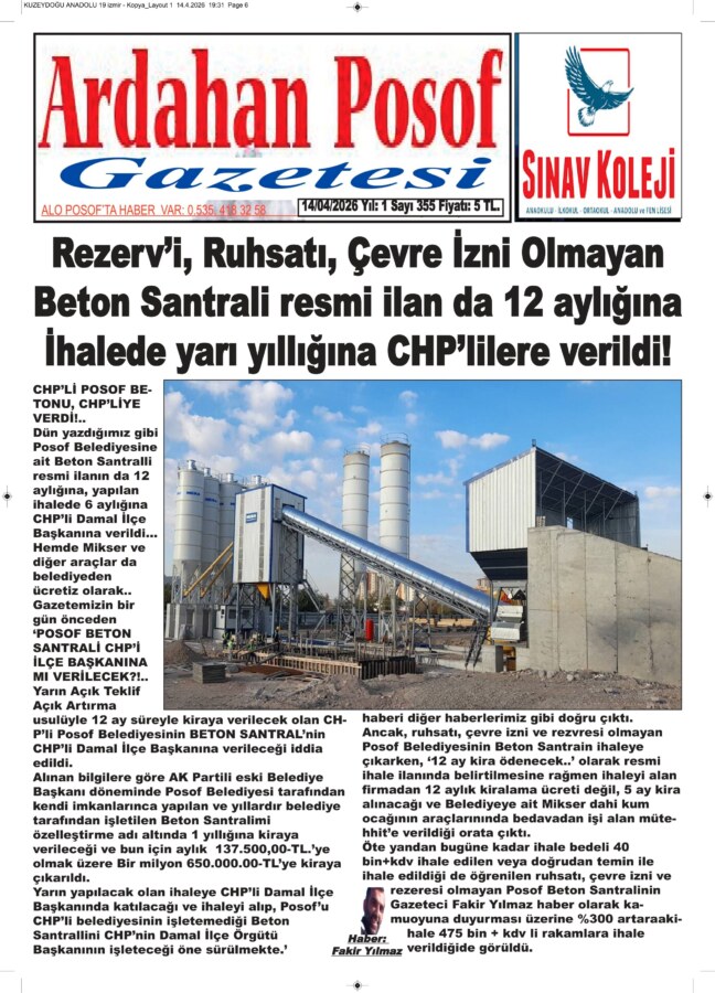 Gazetemizin bir gün önceden ‘POSOF BETON SANTRALİ CHP’İ İLÇE BAŞKANINA MI VERİLECEK?!.. Yarın Açık Teklif Açık Artırma usulüyle 12 ay süreyle kiraya verilecek olan CHP’li Posof Belediyesinin Beton Santrali’nin CHP’li Damal İlçe Başkanına verileceği iddia edildi.
