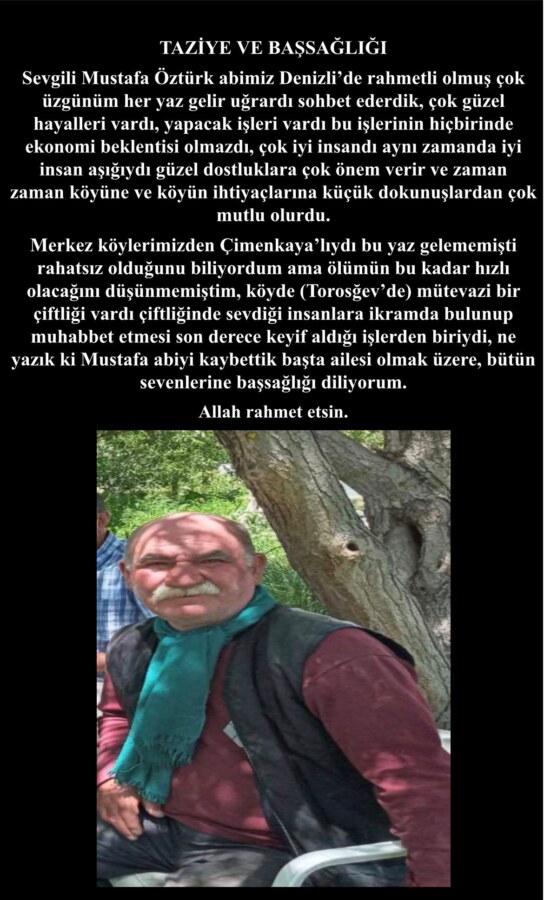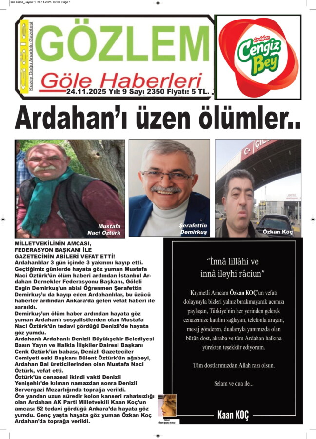 Ardahanlı Ardahanlı Denizli Büyükşehir Belediyesi Basın Yayın ve Halkla İlişkiler Dairesi Başkanı Cenk Öztürk’ün babası, Denizli Gazeteciler Cemiyeti eski Başkanı Bülent Öztürk’ün ağabeyi, Ardahan Bal üreticilerinden olan Mustafa Naci Öztürk, vefat etti. Öztürk’ün cenazesi ikindi vakti Denizli Yenişehir’de kılınan namazdan sonra Denizli Servergazi Mezarlığında toprağa verildi.
