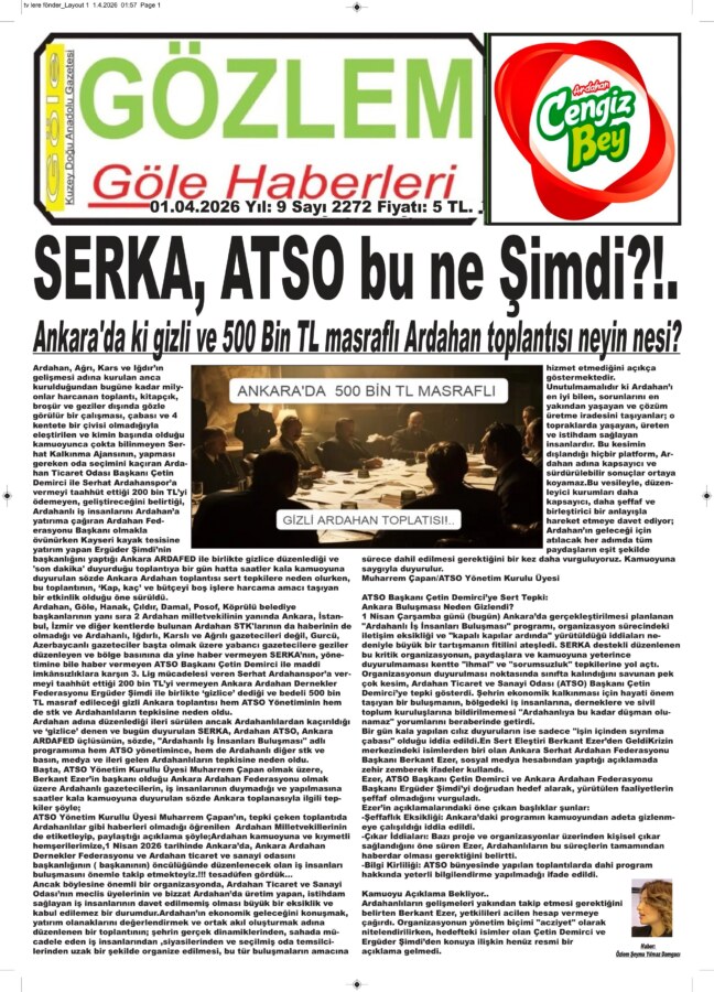 Ardahan, Göle, Hanak, Çıldır, Damal, Posof, Köprülü belediye başkanlarının yanı sıra 2 Ardahan milletvekilinin yanında Ankara, İstanbul, İzmir ve diğer kentlerde bulunan Ardahan STK’larının da haberinin de olmadığı ve Ardahanlı, Iğdırlı, Karslı ve Ağrılı gazetecileri değil, Gurcü, Azerbaycanlı gazeteciler başta olmak üzere yabancı gazetecilere geziler düzenleyen ve bölge basınına da yine haber vermeyen SERKA’nın, yönetimine bile haber vermeyen ATSO Başkanı Çetin Demirci ile maddi imkânsızlıklara karşın 3. Lig mücadelesi veren Serhat Ardahanspor’a vermeyi taahhüt ettiği 200 bin TL’yi vermeyen Ankara Ardahan Dernekler Federasyonu Ergüder Şimdi ile birlikte ‘gizlice’ dediği ve bedeli 500 bin TL masraf edileceği gizli Ankara toplantısı hem ATSO Yönetiminin hem de stk ve Ardahanlıların tepkisine neden oldu.