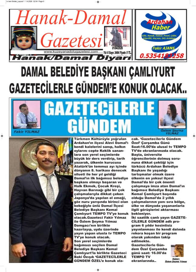 Türkmen Kültürüyle yoğrulan Ardahan’ın ilçesi Alevi Damal’ı kendi kalelerini sanıp, halkın oylarını cepte Keklik sananlara son yerel seçimlerde büyük bir ders verdirip, tarih yazarak, ülkenin kurucusu Atatürk’ün temmuz ayı içinde dünyanın 8. harikası denecek silueti ile her yıl geldiği Damal’ın ilk bağımsız belediye başkanı olmayı başaran ve Halk Ekmek, Çocuk Kreşi, Hayvan Barınağı gibi bir çok çalışmalarıyla dikkat çeken Japonya’da yapılan el emeği, göz nuru yarışında birinci olan bebeğiyle ünlü Damal İlçesi Belediye Başkanı Kemal Çamlıyurt ile Gazeteci Baki Özışık ‘GAZETECİLERLE GÜNDEM ÖZEL’e konuk olacaklar… ‘Gazetecilerle Gündem Özel’ Çarşamba Günü Saat:16.00’da ulusal tv TEMPO TV’de..