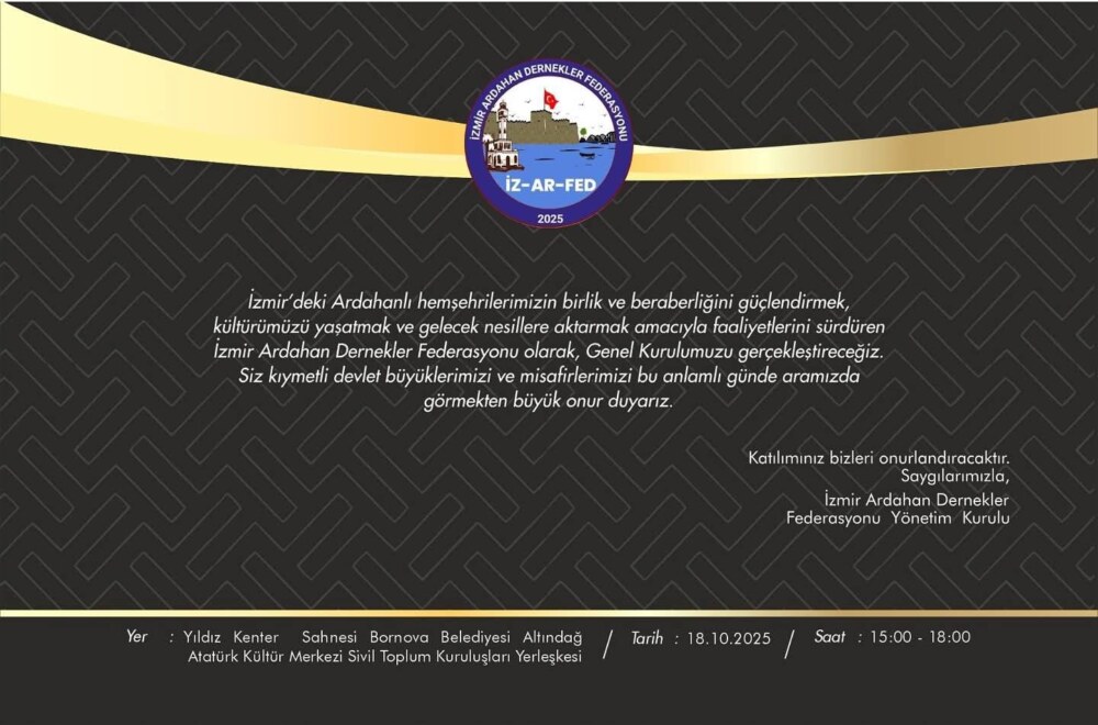 “İzmir’deki Ardahanlı hemşerilerimizim birlik ve beraberliğini güçlendirmek, kültürümüzü yaşatmak ve gelecek nesillere aktarmak amacıyla faaliyetlerini sürdüren İzmir Ardahan Dernekler Federasyonu olarak, Genel Kurulumuzu gerçekleştireceğiz. Siz kıymetli devlet büyüklerimizi ve misafirlerimizi bu anlamlı günde aramızda görmekten büyük onur duyarız.”