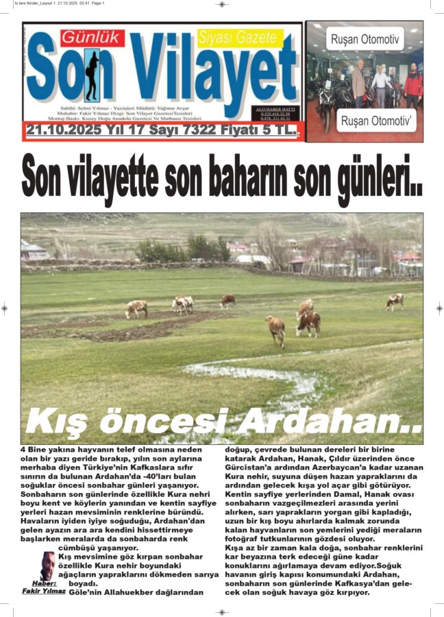 4 Bine yakına hayvanın telef olmasına neden olan bir yazı geride bırakıp, yılın son aylarına merhaba diyen Türkiye’nin Kafkaslara sıfır sınırın da bulunan Ardahan’da -40’ları bulan soğuklar öncesi sonbahar günleri yaşanıyor.