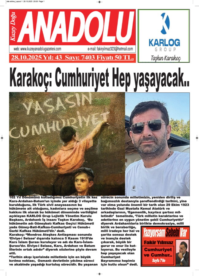 102 Yıl Dönümünü kutladığımız Cumhuriyetin ilk kez Kars-Ardahan-Batum’un içinde yer aldığı 3 vilayette kurulduğunu, ilk Türk sivil anayasasının bu hükümete ait olduğunu, kadınlara seçme ve seçilme hakkını ilk olarak bu hükümet döneminde verildiğini açıklayan KARLOG Grup Lojistik Yönetim Kurulu Başkanı, Ardahanlı İş insanı Taşkın Karakoç, ‘Bu hükümetin adı Güneybatı Kafkas Geçici Hükümeti yada Güney-Bati-Kafkas-Cumhuriyeti ve Cenub-ı Garbi Kafkas Hükümeti’dir.’ dedi.