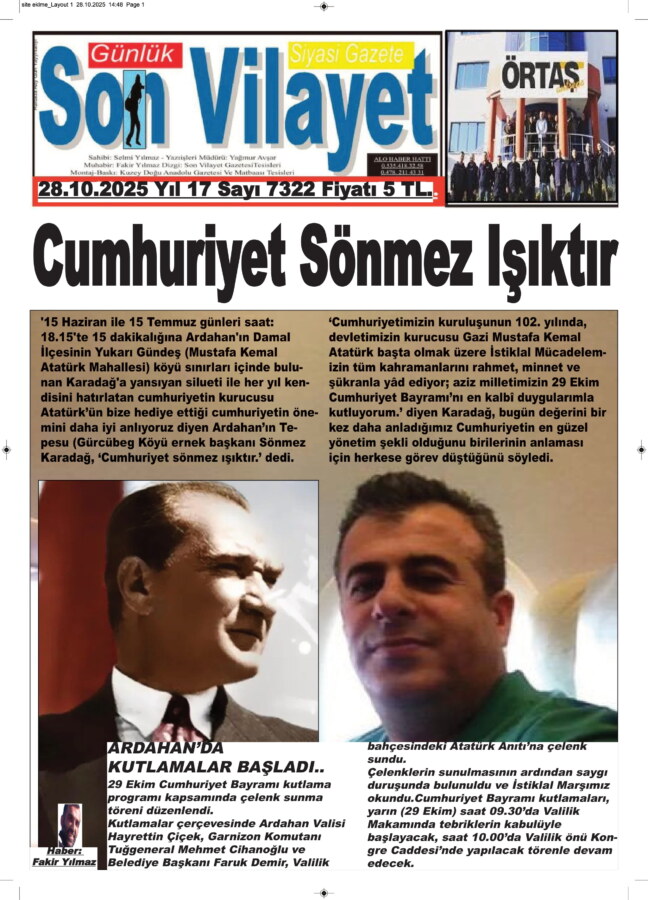 ’15 Haziran ile 15 Temmuz günleri saat: 18.15’te 15 dakikalığına Ardahan’ın Damal İlçesinin Yukarı Gündeş (Mustafa Kemal Atatürk Mahallesi) köyü sınırları içinde bulunan Karadağ’a yansıyan silueti ile her yıl kendisini hatırlatan cumhuriyetin kurucusu Atatürk’ün bize hediye ettiği cumhuriyetin önemini ‘her geçen gün daha iyi anlıyoruz..’ diyen Ardahan’ın Tepesu (Gürcübeg) Köyü Dernek Başkanı Sönmez Karadağ Cumhuriyet Sönmez ışıktır dedi.