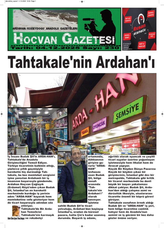 Türkiye ticaretinin kalbinin attığı, yüzlerce yıllık geçmişiyle hareketin hiç durmadığı Tahtakale, bu kez memleket sevgisini işine yansıtan Ardahanlı bir iş insanının başarısıyla gündemde. Ardahan Hoçvan Çağlayık (Erdemel) Köyü’nden çıkan Budak Şit, İstanbul’un en hareketli merkezinde kurduğu iş yerinin adını “ARDA-HAN” koyarak hem memleketine vefa gösteriyor hem de ticari başarısıyla adından söz ettiriyor.