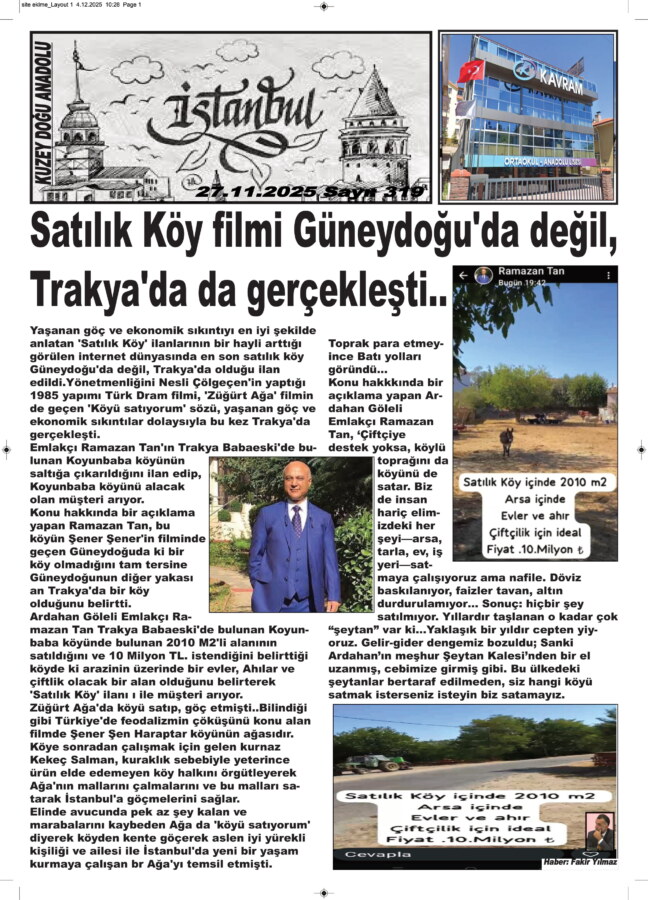 Emlakçı Ramazan Tan’ın Trakya Babaeski‘de bulunan Koyunbaba köyünün saltığa çıkarıldığını ilan edip, Koyunbaba köyünü alacak olan müşteri arıyor.