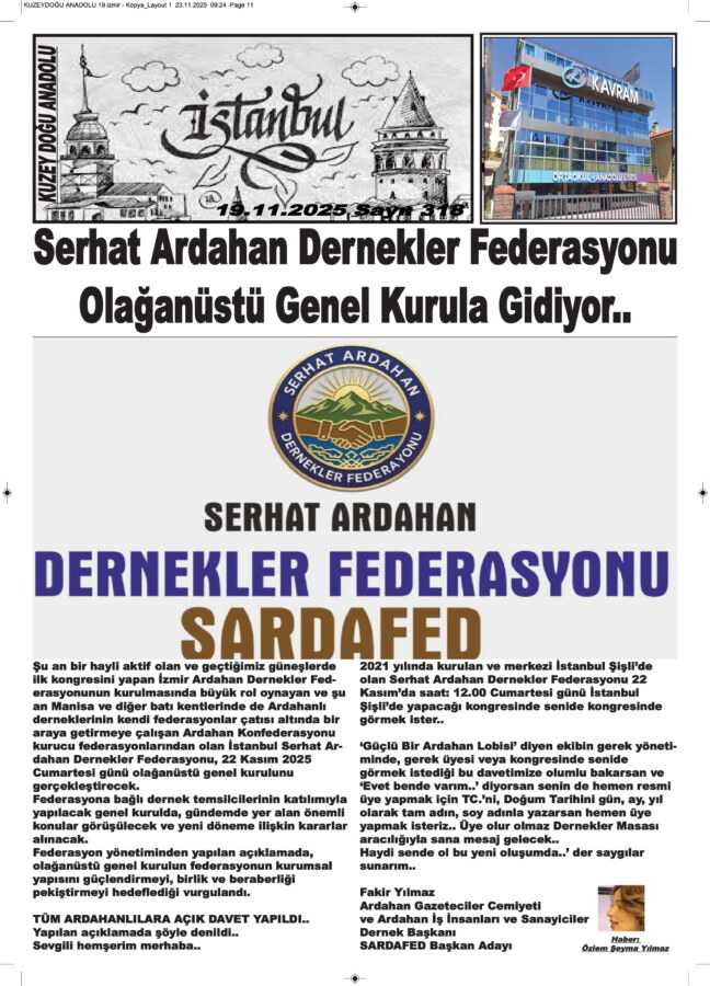 Şu an bir hayli aktif olan ve geçtiğimiz güneşlerde ilk kongresini yapan İzmir Ardahan Dernekler Federasyonunun kurulmasında büyük rol oynayan ve şu an Manisa ve diğer batı kentlerinde de Ardahanlı derneklerinin kendi federasyonlar çatısı altında bir araya getirmeye çalışan Ardahan Konfederasyonu kurucu federasyonlarından olan İstanbul Serhat Ardahan Dernekler Federasyonu, 22 Kasım 2025 Cumartesi günü olağanüstü genel kurulunu gerçekleştirecek.