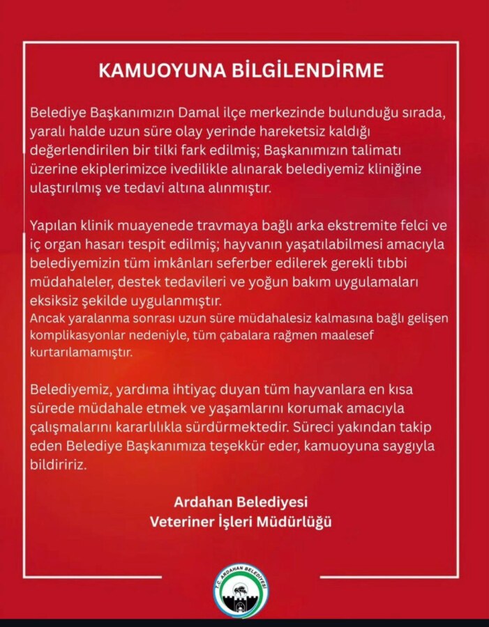 Ardahan Belediyesine ait sanal sayfada ‘BAŞKAN DEMİR’DEN YARALI TİLKİ’YE ŞEFKAT ELİ’ başlığı ile yayınlanan mesajda türkücü başkanın Damal ilçesine yaptığı ziyaret sırasında araç çarpması sonucu yaralanan bir tilkiye sahip çıktığı belirtilse de işi olmadığı halde müdahale ettiğini belirtip, hayvan sever kesilirken, yaralı tilkiyi Doğa Koruma Müdürlüğüne değil de belediyesinin olmayan mezbahanesin de sorumlu olduğunu belirttiği bir veterinere sevk ettirmesi yaralı tikinin ölümüne neden oldu.