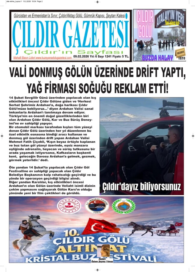 Bir otomobil markası tarafından kışları tüm yüzeyi donan Çıldır Gölü üzerinden her yıl düzenlenen bu özel etkinlik esnasına bindiği aracı kullanan ve donmuş göl üzerinden drift yapan Ardahan Valisi Mehmet Fatih Çiçekli, ‘Kışın beyaz örtüyle kaplanan ve buz tutan göl yüzeyi üzerinde, eşsiz manzara eşliğinde adrenalin, heyecan ve sürüş tutkusunu bir arada yaşamak istiyorsanız, Kafkasların başkenti kent, geleceğin Davosu Ardahan’a gelmek, gezmek, görmek yeterlidir.’ dedi.