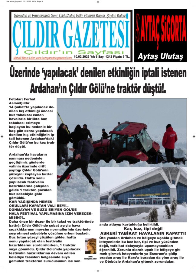 Daha önce bir dozer ile bir taksi ve traktöründe battığı Çıldır Gölü’nde şubat ayıyla hava sıcaklıklarının mevsim normallerinin üzerinde seyretmesi sebebiyle çözülme erken başladı. Buz tutan yüzeyi çözülen gölde, hafta sonu yapılacak olan festivalin hazırlıklarını sürdürülürken, 1 traktör suya gömüldü. Çıldır Gölü’nde yapılacak festivalin hazırlıklarına devam edilen belediye tesisleri bölgesinde suya gömülen traktörün sürücüsünün ise son anda atlayıp kurtulduğu belirtildi.