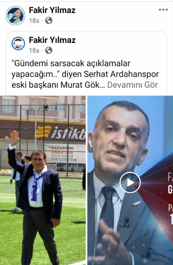 Gazeteci Fakir Yılmaz’ın TEMPO TV’de canlı olarak sunduğu GAZETECİLERLE GÜNDEM adlı program telefonla bağlanan Serhat Ardahanspor Başkanı İskender Alihanoğlu, Serhat Ardahanspor’un eski başkanı Murat Gökdemir’in de katıldığı canlı yayında yaptığı açıklamada yarında tezi yok takımın içinde filimler çeviren ve adeta paralel yapı oluşturanları yönetimde silip, yerlerine samimi insanları alacağını belirterek başta sanal ortam da sorumlu olanları, sağda solda başkanlık satanları, desterilir bulamayıp, yeni desteri isteyenleri, söz verip, parayı göndermeyen Ankara federasyonu gibi bu takıma, b u entte zarar verenn herkesi kamuoyuna anlatıp, deşifre edeceğim.’ dedi.