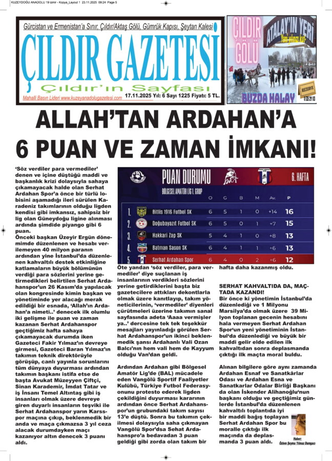 İçine girdiği ekonomik sorular dolaysıyla Kars spor maçına çıkamayacaklarını Gazeteci Fakir Yılmaz’a bildiren ve Gazeteci Baran Yılmaz’a canlı yayında anlatan Serhat Ardahanspor Teknik heyeti ve futbolcuların feryadının basına yansıması ardından bir anda karışan Serhat Ardahaspor üç, beş kişinin sahiplenip gündem oluşturmasıyla bulduğu moralle çıktığı Karsspor maçında 3 puanla dönünce rahat bir nefes aldırdı.