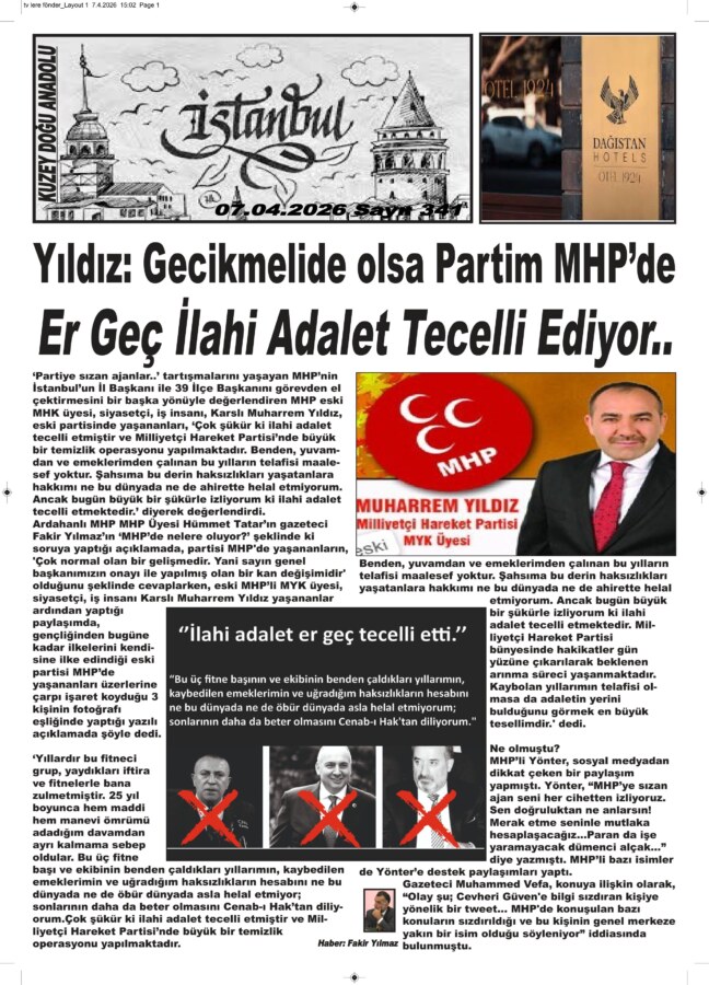 ‘Partiye sızan ajanlar..’ tartışmalarını yaşayan MHP’nin İstanbul’un İl Başkanı ile 39 İlçe Başkanını görevden el çektirmesini bir başka yönüyle değerlendiren MHP eski MHK üyesi, siyasetçi, iş adamı, Karslı Muharrem Yıldız, eski partisinde yaşananları, ‘Çok şükür ki ilahi adalet tecelli etmiştir ve Milliyetçi Hareket Partisi’nde büyük bir temizlik operasyonu yapılmaktadır. Benden, yuvamdan ve emeklerimden çalınan bu yılların telafisi maalesef yoktur. Şahsıma bu derin haksızlıkları yaşatanlara hakkımı ne bu dünyada ne de ahirette helal etmiyorum. Ancak bugün büyük bir şükürle izliyorum ki ilahi adalet tecelli etmektedir.’ diyerek değerlendirdi.