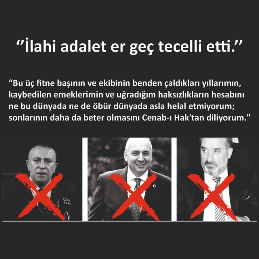 ‘Yıllardır bu fitneci grup, yaydıkları iftira ve fitnelerle bana zulmetmiştir. 25 yıl boyunca hem maddi hem manevi ömrümü adadığım davamdan ayrı kalmama sebep oldular. Bu üç fitne başı ve ekibinin benden çaldıkları yıllarımın, kaybedilen emeklerimin ve uğradığım haksızlıkların hesabını ne bu dünyada ne de öbür dünyada asla helal etmiyor; sonlarının daha da beter olmasını Cenab-ı Hak’tan diliyorum.Çok şükür ki ilahi adalet tecelli etmiştir ve Milliyetçi Hareket Partisi’nde büyük bir temizlik operasyonu yapılmaktadır.