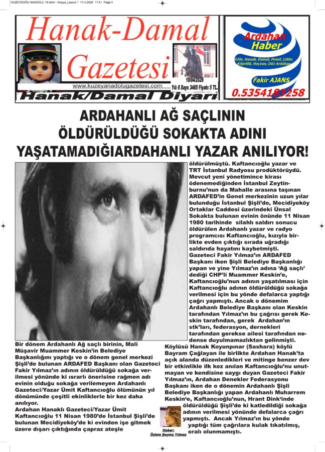 Bir dönem Ardahanlı Ağ saçlı birinin, Mali Müşavir Muammer Keskin’in Belediye Başkanlığını yaptığı ve o dönem genel merkezi Şişli’de bulunan ARDAFED Başkanı olan Gazeteci Fakir Yılmaz’ın adının öldürüldüğü sokağa verilmesi yönünde ki ısrarlı önerisine rağmen adı evinin olduğu sokağa verilemeyen Ardahanlı Gazeteci/Yazar Ümit Kaftancıoğlu ölümünün yıl dönümünde çeşitli ekinliklerle bir kez daha anılıyor.