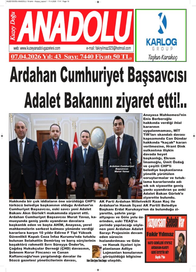 Ardahan Cumhuriyet Başsavcısı Murat Yavuz, kamuoyunda geniş yankı uyandıran davalara başkanlık eden ve başta AHİM, Anayasa, yerel mahkemelerin serbest kalması yönünde verdiği kararlara karşın 10 yıldır Edirne F Tipi Yüksek Güvenlikli Kapalı Ceza İnfaz Kurumu’nda tutuklu bulunan Selahattin Demirtaş ve barış sürçlerinin başaktörü rahmetli Sırrı Süreyya Önder’in, Çağdaş Hukukçular Derneği (ÇHD) davasının, Şebnem Korur Fincancı ve Canan Kaftancıoğlu’nun yargılandığı davalar ile Sözcü gazetesi yöneticilerinin davası, Anayasa Mahkemesi’nin Enis Berberoğlu hakkında verdiği ihlal kararının uygulanmaması, MİT TIR’ları skandalı davası kapsamında Can Dündar hakkında “kaçak” kararı verilmesine, Hrant Dink suikastına ilişkin davada heyet başkanlığı, Ekrem İmamoğlu, Ümit Özdağ ve çeşitli CHP’li belediye başkanlarına yönelik yürütülen soruşturmalar ve tutuklama kararlarında adı sık sık siyasette geniş yankı uyandıran şu anki Adalet Bakan Gürlek’e ziyarette bulundu.
