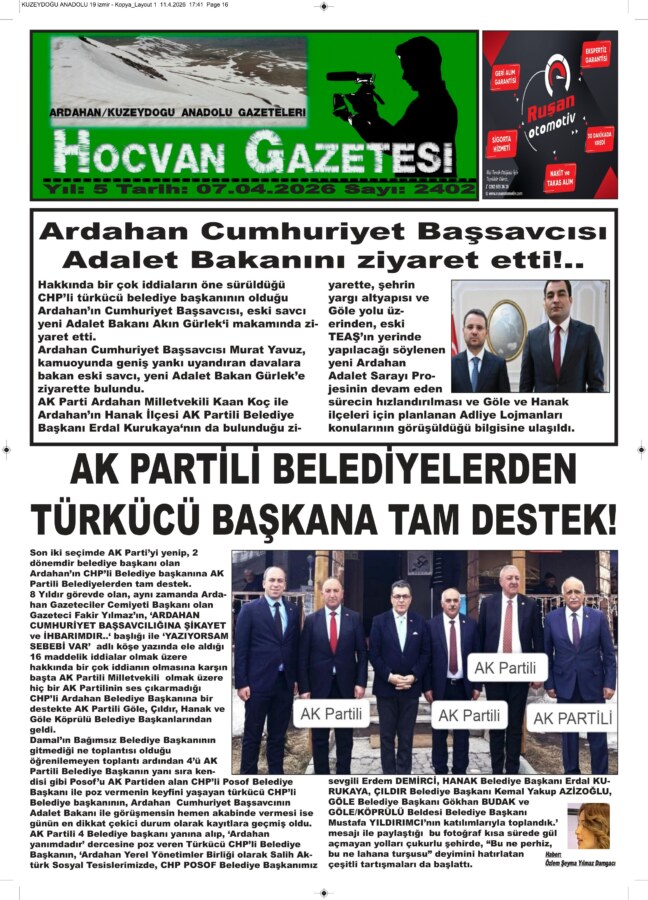 8 Yıldır görevde olan, aynı zamanda Ardahan Gazeteciler Cemiyeti Başkanı olan Gazeteci Fakir Yılmaz’ın, ‘ARDAHAN CUMHURİYET BAŞSAVCILIĞINA ŞİKAYET ve İHBARIMDIR..‘ başlığı ile ‘YAZIYORSAM SEBEBİ VAR’ adlı köşe yazında ele aldığı 16 maddelik iddialar olmak üzere hakkında bir çok iddianın olmasına karşın başta AK Partili Milletvekili olmak üzere hiç bir AK Partilinin ses çıkarmadığı CHP’li Ardahan Belediye Başkanına bir destekte AK Partili Göle, Çıldır, Hanak ve Göle Köprülü Belediye Başkanlarından geldi.