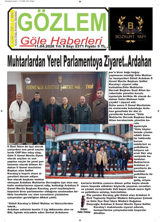 Göle Muhtarlar Dernek Başkanı Suat Altun beraberinde yönetim kurulu üyeleriyle birlikte ilk olarak Ardahan Valisi Mehmet fatih çiçekli i ziyaret etti. daha sonra İl Genel Meclisinin de aralarında bulunduğu e Ardahan genelinde bir dizi ziyaretlerde bulunan.