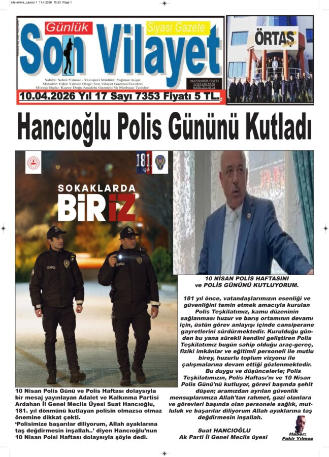 10 Nisan Polis Günü ve Polis Haftası dolaysıyla bir mesaj yayınlayan Adalet ve Kalkınma Partisi Ardahan İl Genel Meclis Üyesi Suat Hancıoğlu, 181. yıl dönümünü kutlayan polisin olmazsa olmaz önemine dikkat çekti.